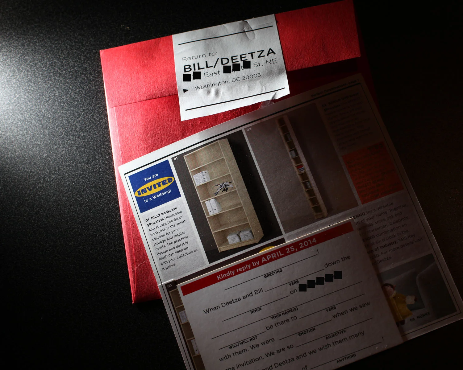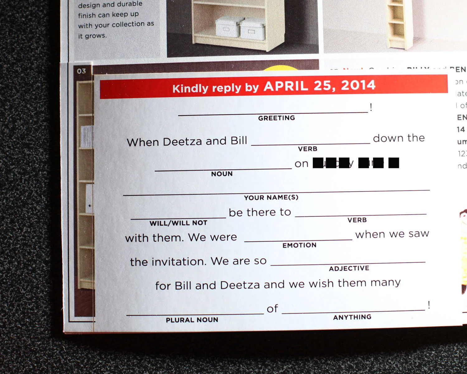 Here's just another example of how cool Gilded Brides are! My bride fashioned her invites after an IKEA catalog page. Her RSVP is a Mad-lib. The neatest thing about this is that the featured products really do share the namesakes of the Bride and Groom! Stay tuned for our post about their amazing wedding that we will be attending at the Baltimore Museum of Industry! (Details blocked to discourage wedding crashers. ;)
