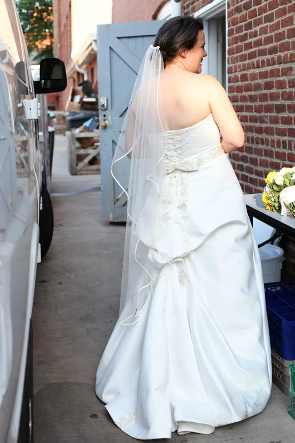 The bride was sporting some custom changes that we made to her gown. Her bodice was originally straight across and we made it a sweetheart neckline. We also put in a grommet corset back for Sarah.