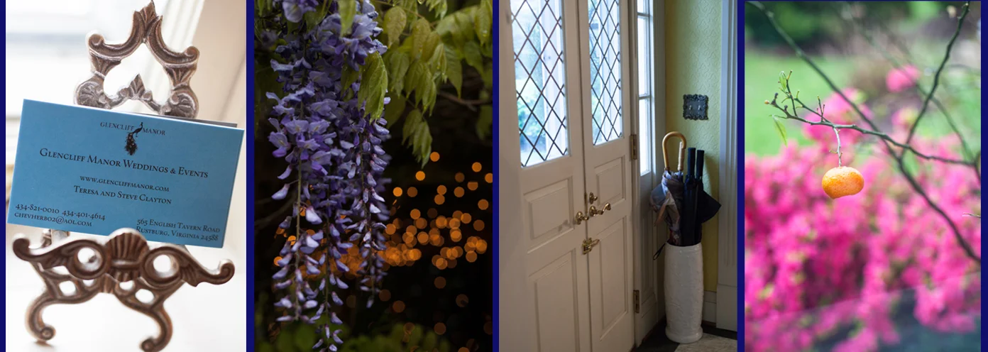 Contact info for Glencliff, Wisteria in bloom, umbrellas awaiting, and a single orange left on the tree