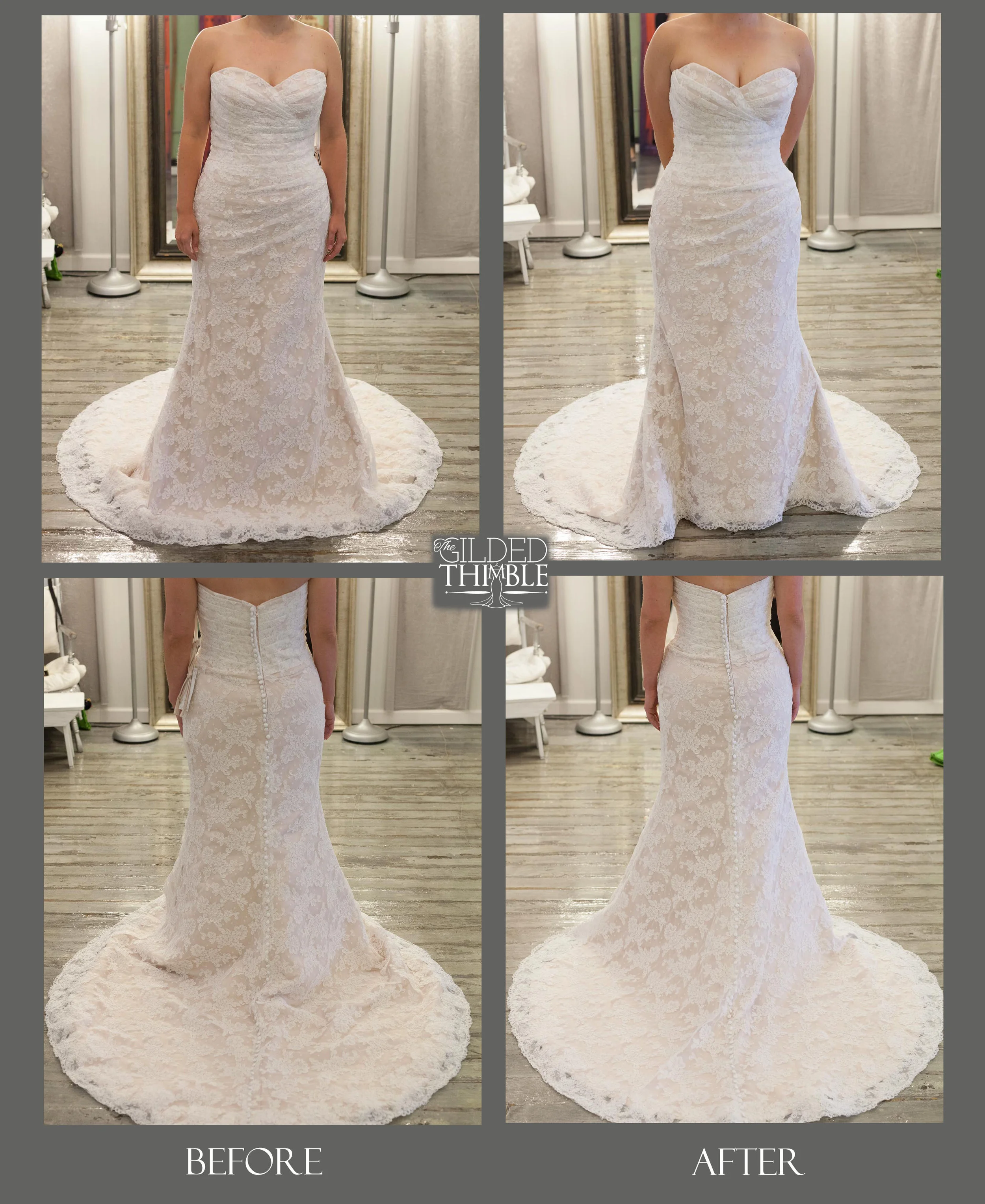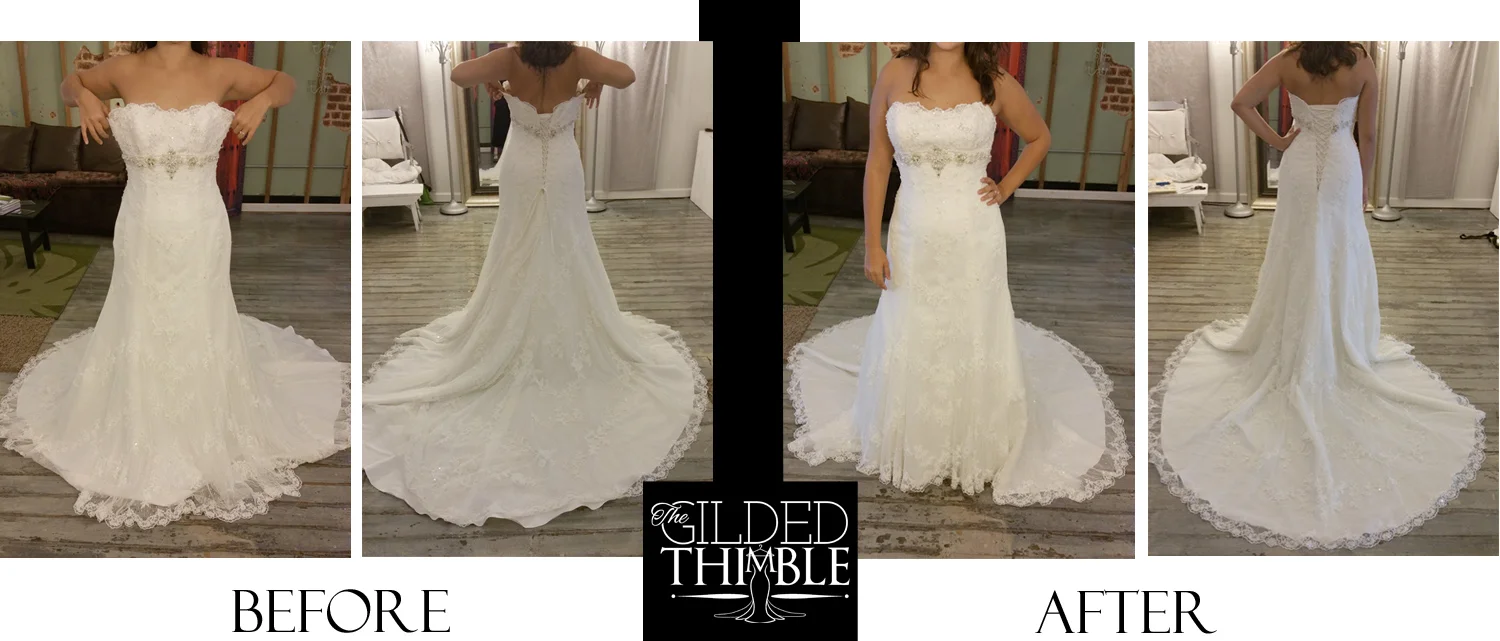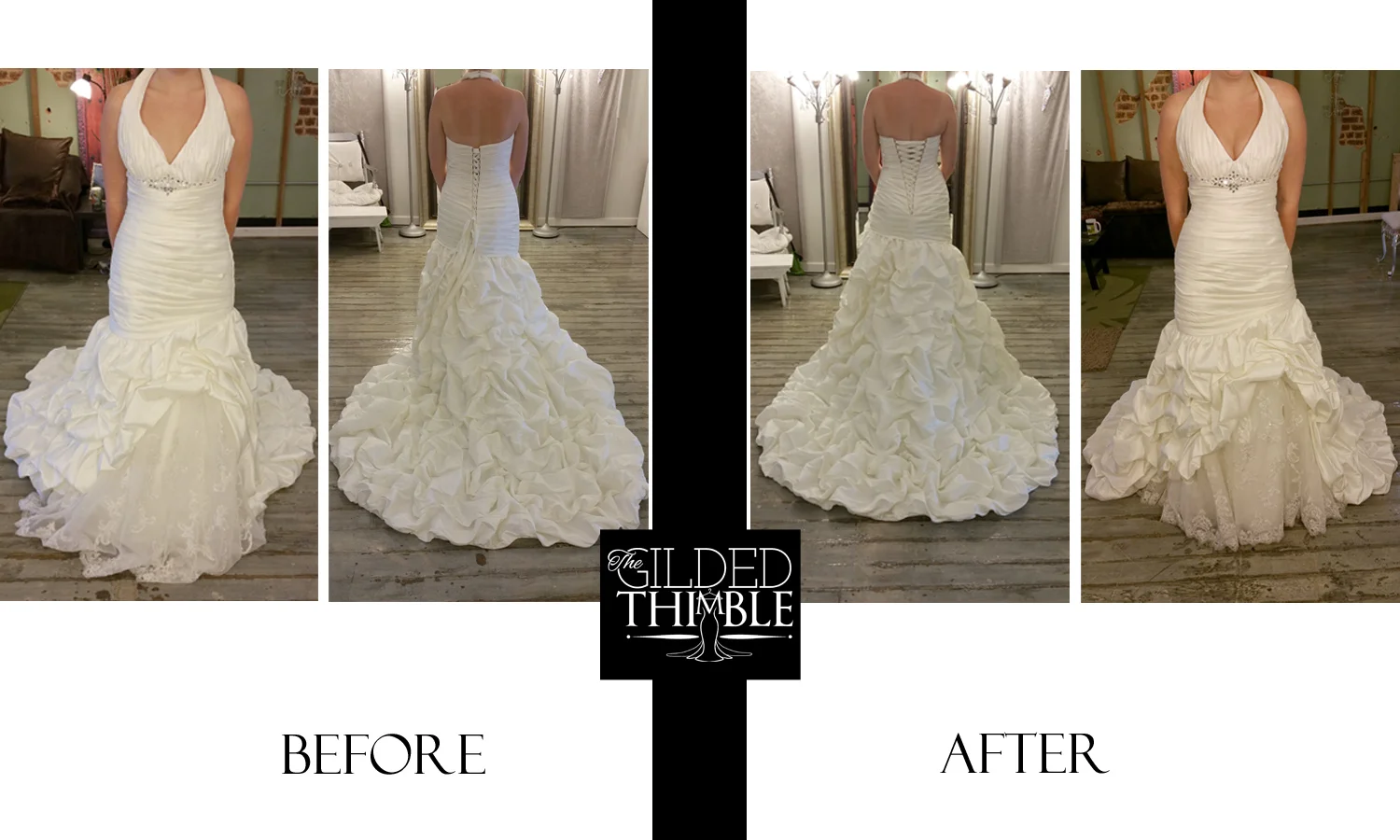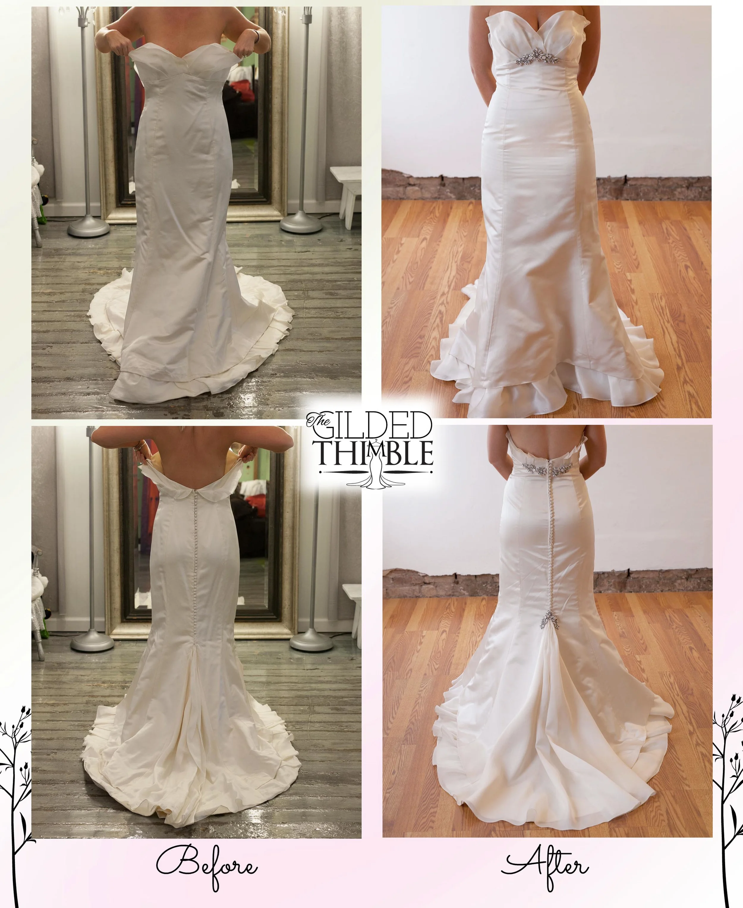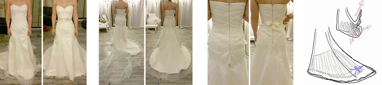 Her dress was a silk organza that originally had pick-ups. Lauren was not digging the pick-ups! We removed them and for design details, we had triangular shaped gussets that echoed the A-line of the bridal satin under layer. Check out the train in the second picture! It was unruly and did not compliment her figure at all. We obviously corrected the fit of the dress to accentuate her waist, but as we repaired the zipper, we added another gusset that would flair out from under her bow. That bow... it is a sash from BHLDN, (aka, Beholden.) Good purchase choice, Lauren!! The fourth picture leads me to a whole different convo...