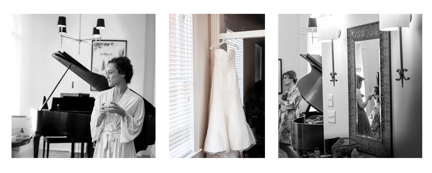 As usual, I delivered the dress, freshly steamed. The bridesmaids were with-it! They were already dressed when I arrived, and not one of them needed their gown steamed. Mom needed a tuck and tack, but was otherwise beautiful. Betsy slipped into her gown super fast, and it was showtime. Her train performed beautifully due to the great stabilizing job that my assistant, Yael did. During her pre-wedding pics, Betsy's dress tore a little at the hem. It was a quick stitch-up and she was photo ready again.