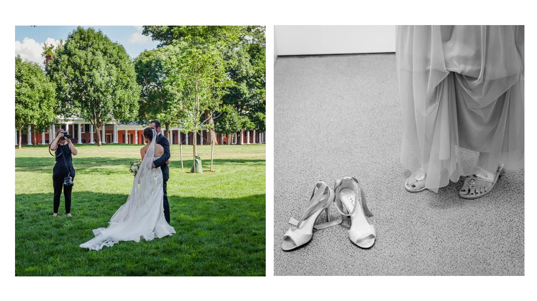 Here's Rachel Crouch from A Muse Photography hard at work. The black and white pic shows sis Rachel in her flats. We stitched pick ups into her bridesmaid's dress so that she could have happy feet during the reception.