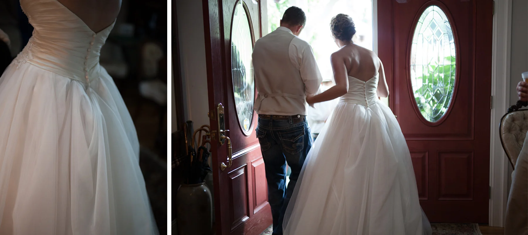 Casey is looking out the window while her gown is bustled up and ready for the reception. The ground was still wet from the morning rain, so I pinned up her chiffon layer in 4 extra places to keep it a little cleaner.